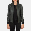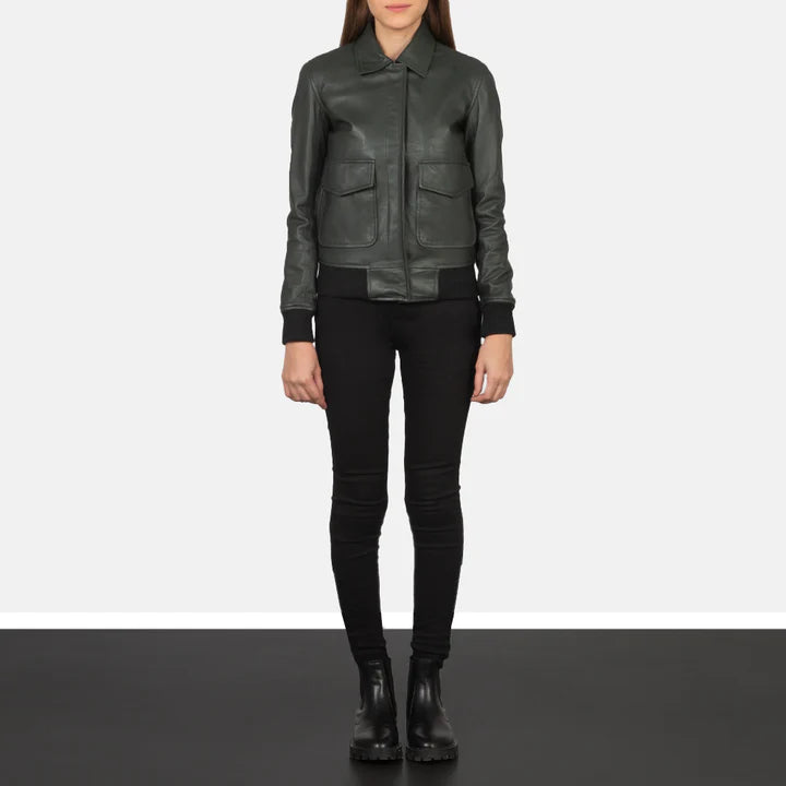 A-2 Green Leather Bomber Jacket with Button Flap & Rib Knit Cuffs