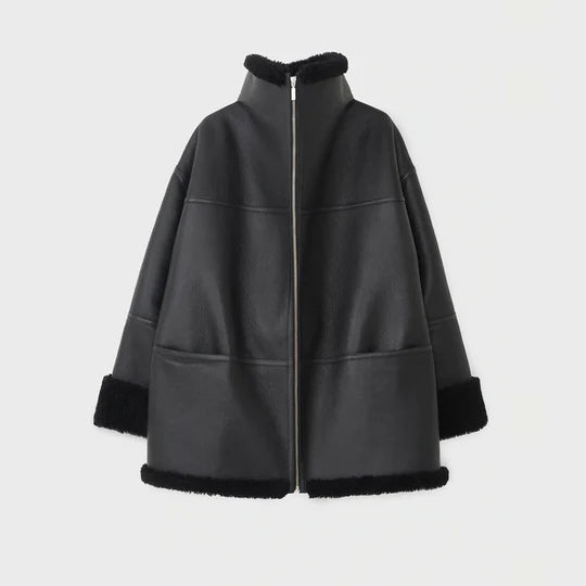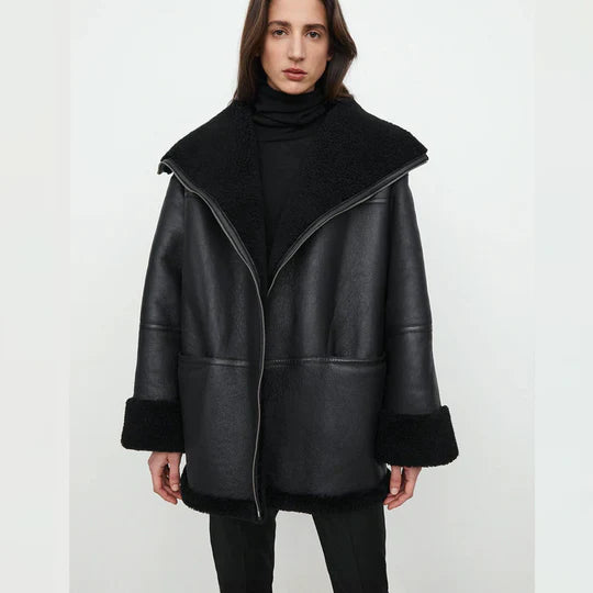 Stay cozy and chic this winter with LETHARA B3 RAF Aviator Styled Sheepskin Shearling Leather Jacket. Crafted from luxurious sheepskin shearling, this jacket combines warmth with style, perfect for colder days. Designed with an oversized fit, it features a high-standing collar that transforms into wide lapels when left open, adding versatility to your look. The front zipper fastening, and inseam pockets offer a sleek and functional design, while the stitched leather panels provide a touch of vintage charm. Pair this timeless piece with jeans and boots for a stylish city stroll.