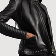 Classic Black Leather Biker Jacket with Snap Button-Band Collar