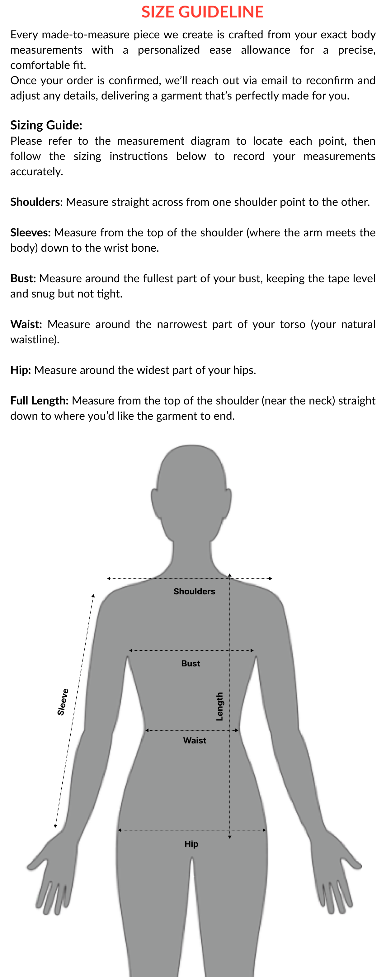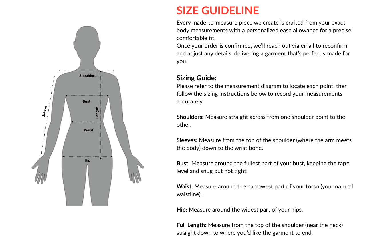 Prefer a tailored fit? Use these body measurements to create something made just for you. Once you're done measuring, you're ready to place your order with confidence.