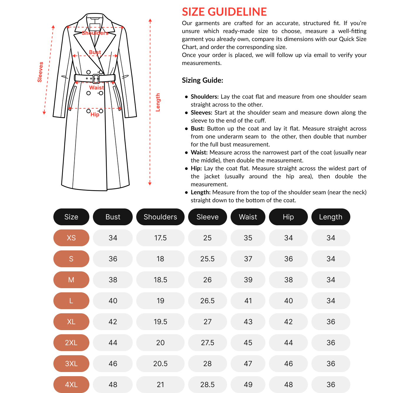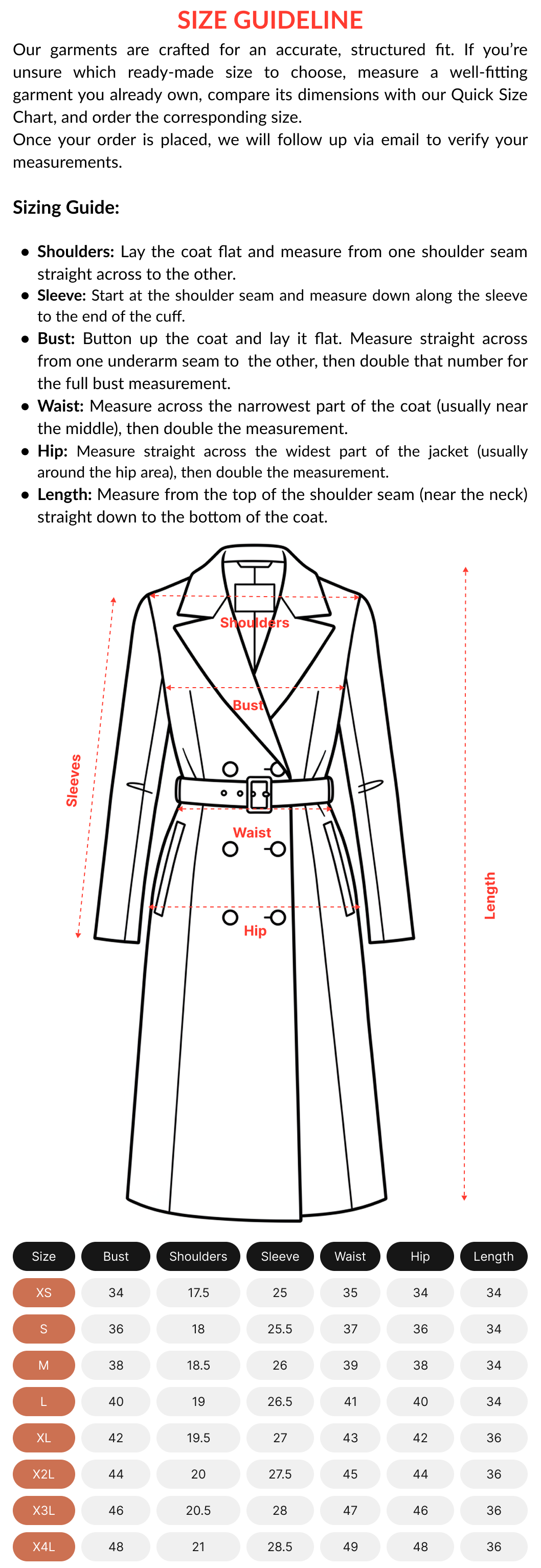 To get the perfect-sized coats, get guidance from Lethara's sizing chart, and make sure to accurately measure your bust, waist, and hips, with enough room for layering. Lethara coats feature adjustable belts, structured fits, and tailored sleeves for a refined silhouette without compromising comfort. If you plan to wear thick layers underneath, sizing up is advisable. For a completely personalized fit, custom sizing options are available.