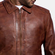 • Burnished Finish: The distressed brown leather with a burnished finish gives the jacket a vintage, rugged look.
