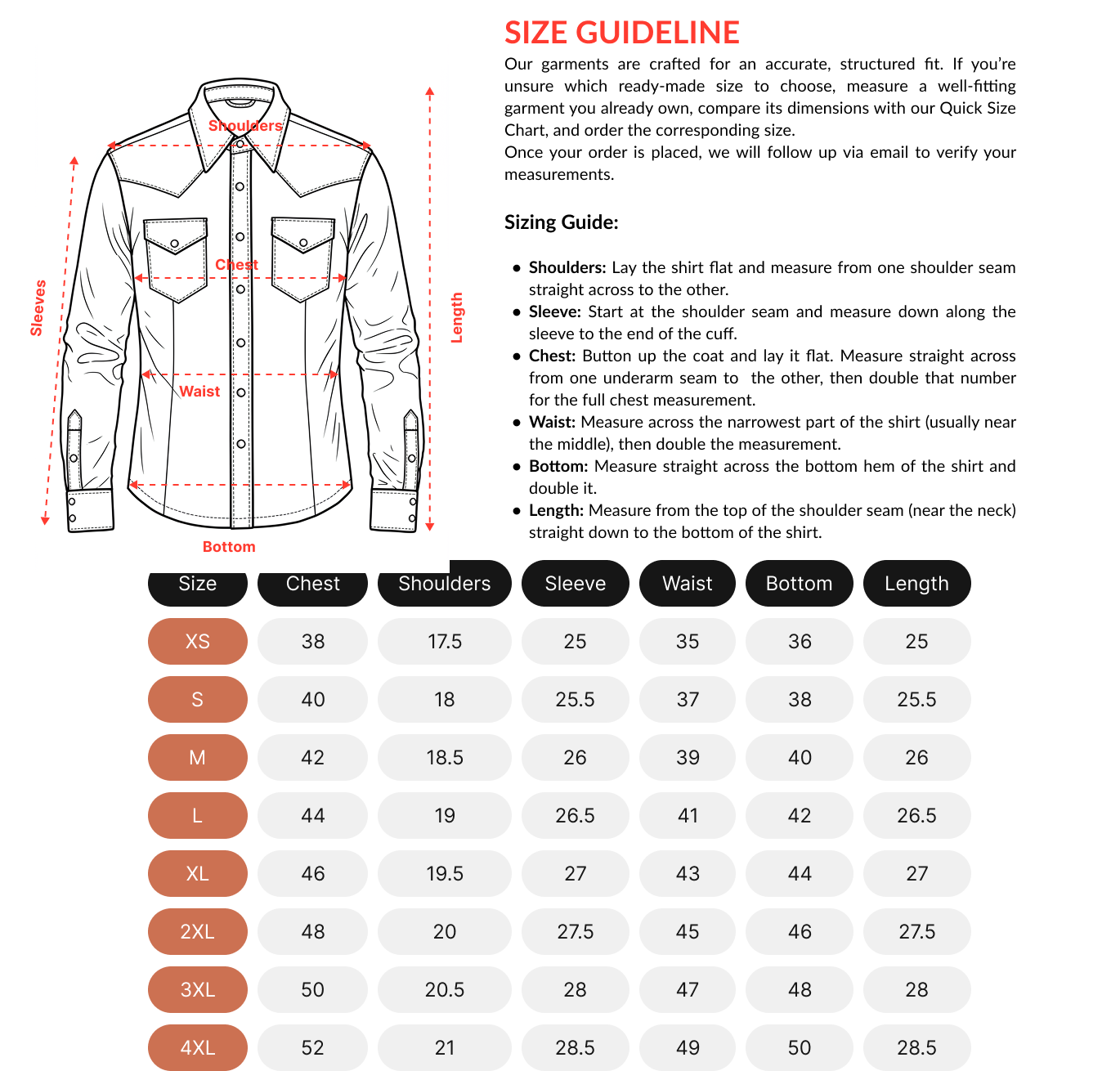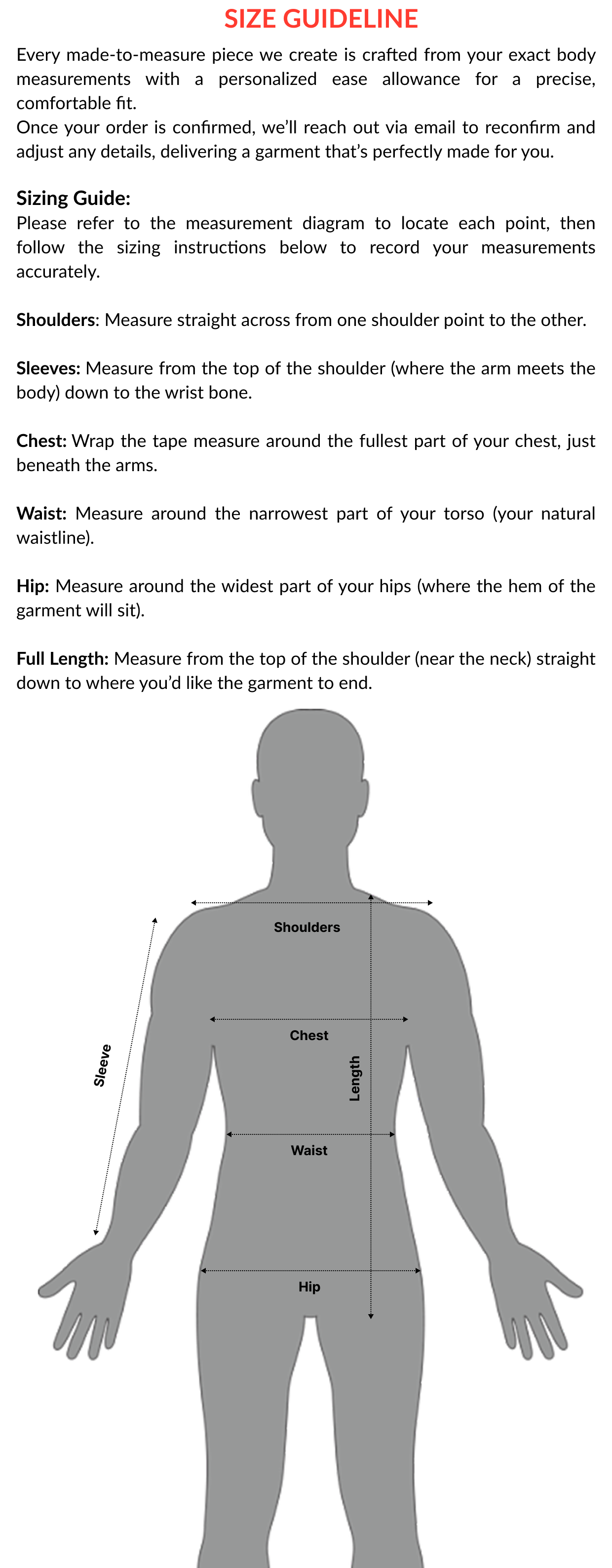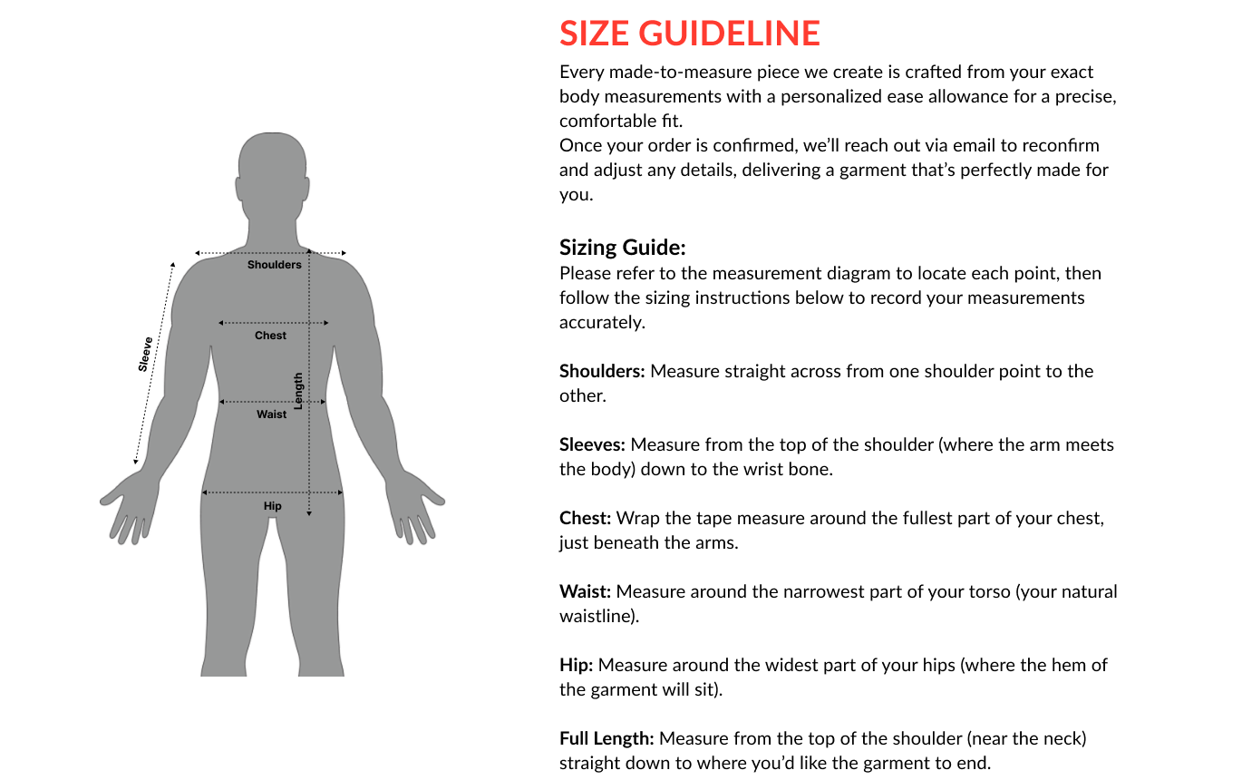 Prefer a tailored fit? Use these body measurements to create something made just for you. Once you're done measuring, you're ready to place your order with confidence.
