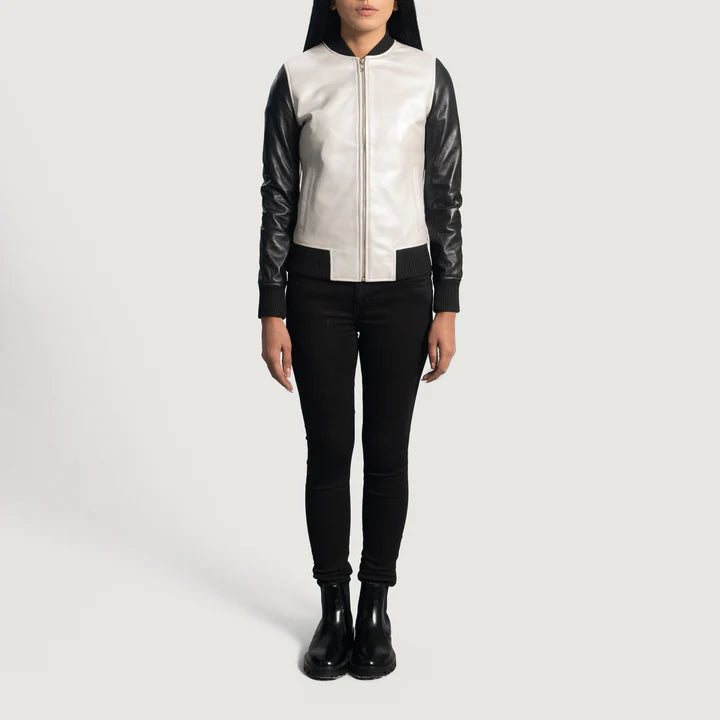 Silver Sheepskin Leather Bomber Jacket with Varsity Collar & Knit Rib Cuffs